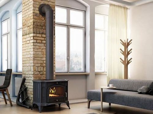 Дверца печи камина декорирована стеклом, которое может выдержать температуру до 750 градусов. Благодаря системе «чистое стекло», вы можете любоваться огнем.