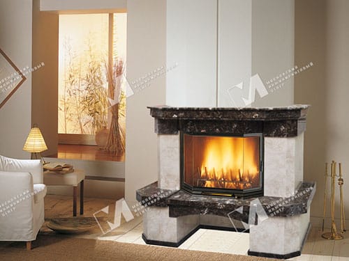 Облицовка фронтальная под топки 700 серии с подъемом. С отделкой дровника. Мрамор Крема Нова и Имперадор Дак.