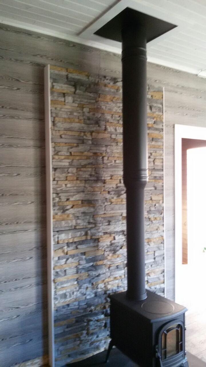 Специалистами нашей компании произведена термоизоляция стены примыкания печи с отделкой декоративным камнем на бетонной основе. Для изоляции пола, в месте установки дровяной отопительной печи, произведена укладка специального стального листа заводской готовности черного цвета и оригинального дизайна.